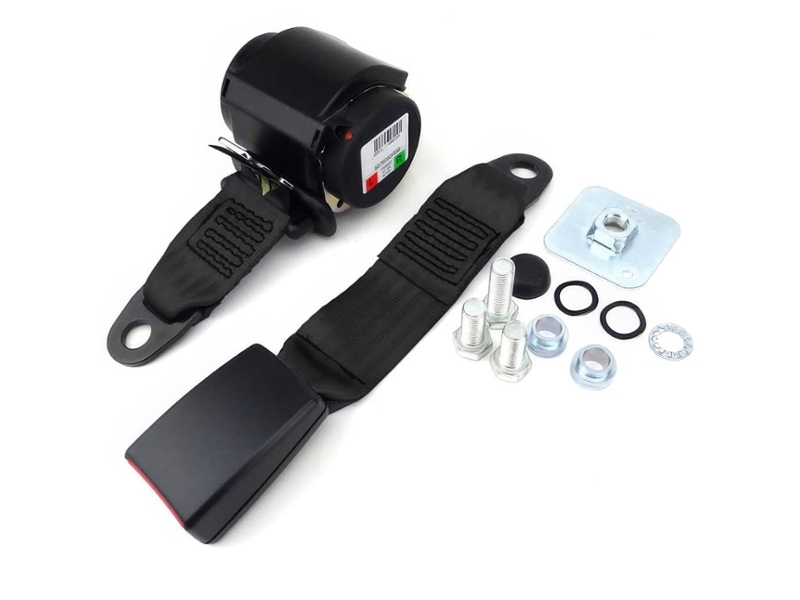 3-point automatic retractable REAR seat belt kit, in black. Does not use the standard C-post nor the MPi fixing in the rear pocket. Installation involves attaching the reel to the parcel shelf, ensuring a flat surface for proper extraction and retraction (the belt does not retract except when mounted on a flat surface; weld plate included). Compatible with all Classic Mini models up to 1996. Made in the U.K. Actual appearance may vary from photo(s) shown.